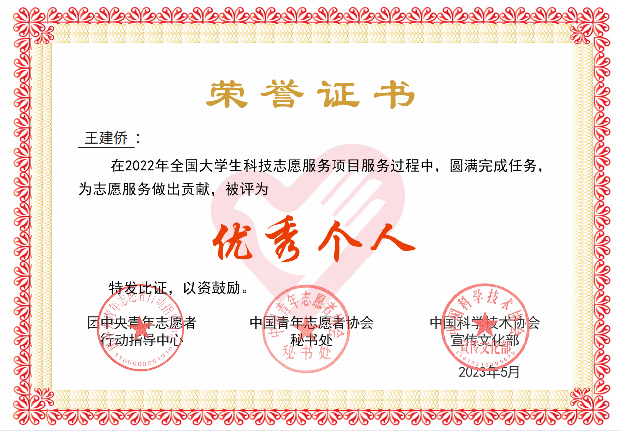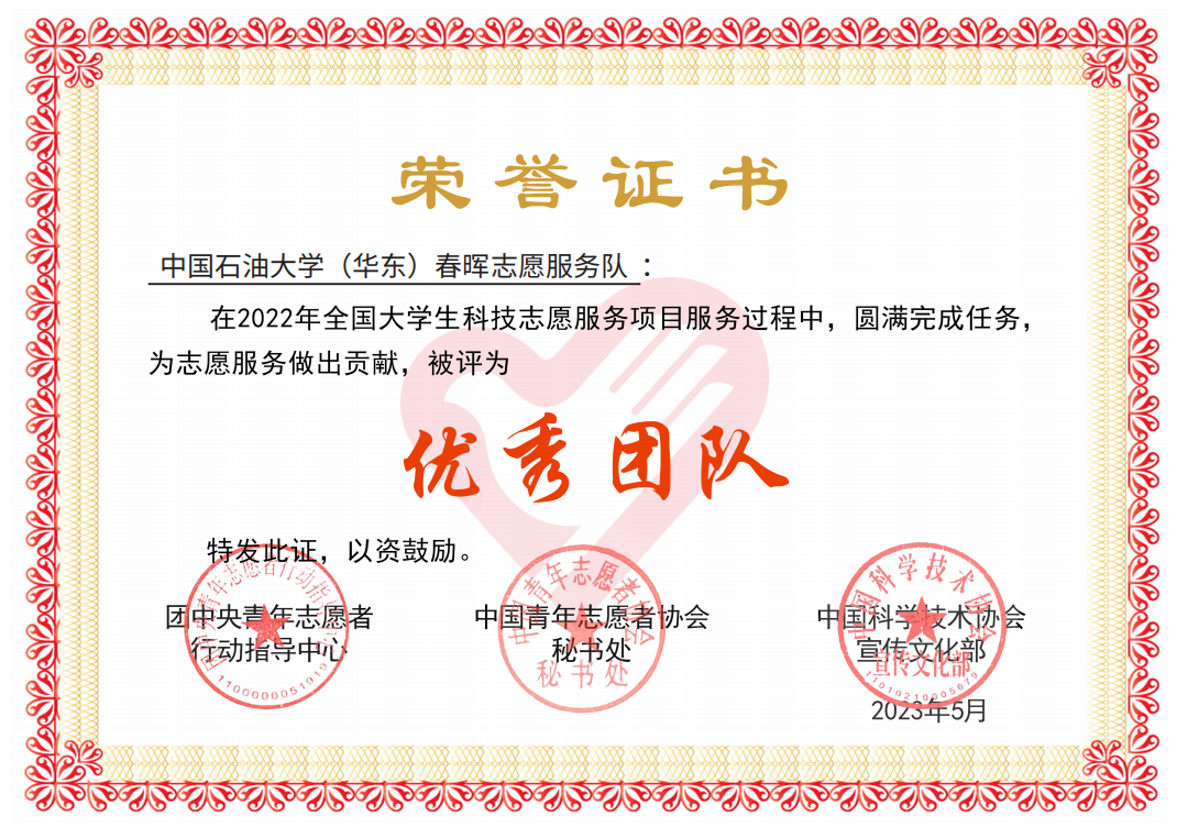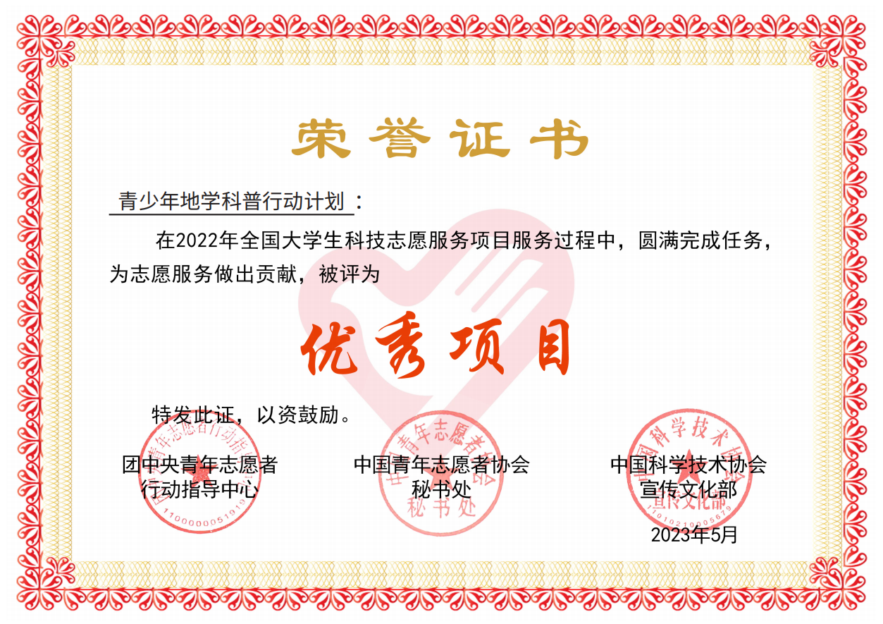 近日,MG冰球突破官网网站春晖志愿服务队收到中国青年者协会秘书处、团中央青年志愿者行动指导中心联合下发的荣誉证书,春晖志愿服务队被评为优秀团队,青少年地学科普行动计划被评为优秀项目,项目负责人王建侨被评为优秀个人。