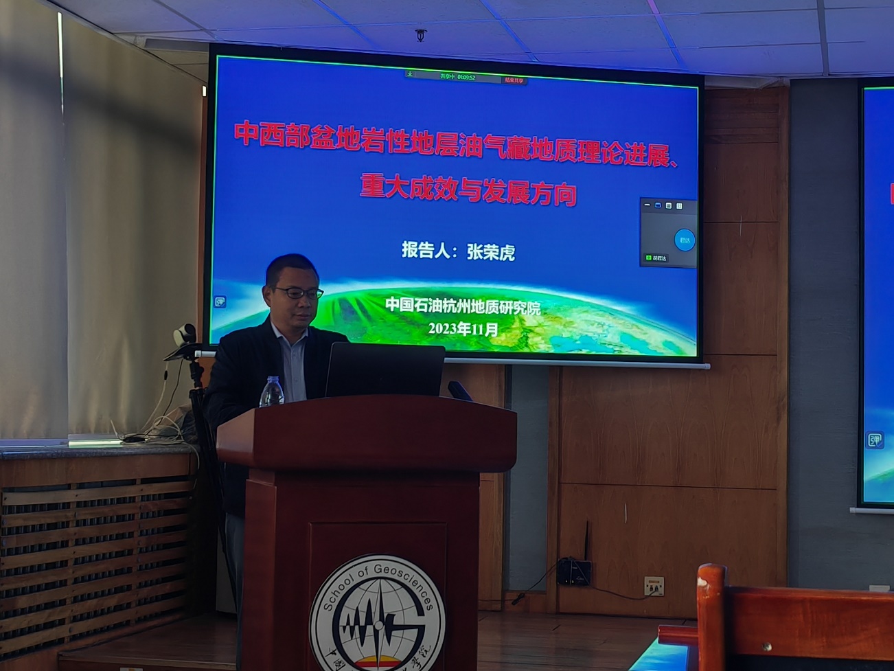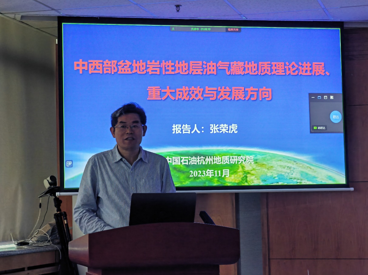 2023年11月5日上午,MG冰球突破官网网站教育部“油气田开发地质课程虚拟教研室”举办线上线下教学公开课—行业前沿专题讲座,邀请了中国石油勘探开发研究院杭州地质研究院企业高级专家张荣虎教授级高级工程师,作题为《中西部盆地岩性地层油气藏地质理论进展、重大成效与发展方向》的专题报告,MG冰球突破官网网站地质资源与地质工程研究生、部分资源系教师,以及来自山东科技大学、吉林大学、中国地质大学(武汉)和贵州大学等全国十余所高校科研院所80余人参加了线上、线下会议,教育部虚拟教研室负责人、资源系主任张立强教授主持会议。