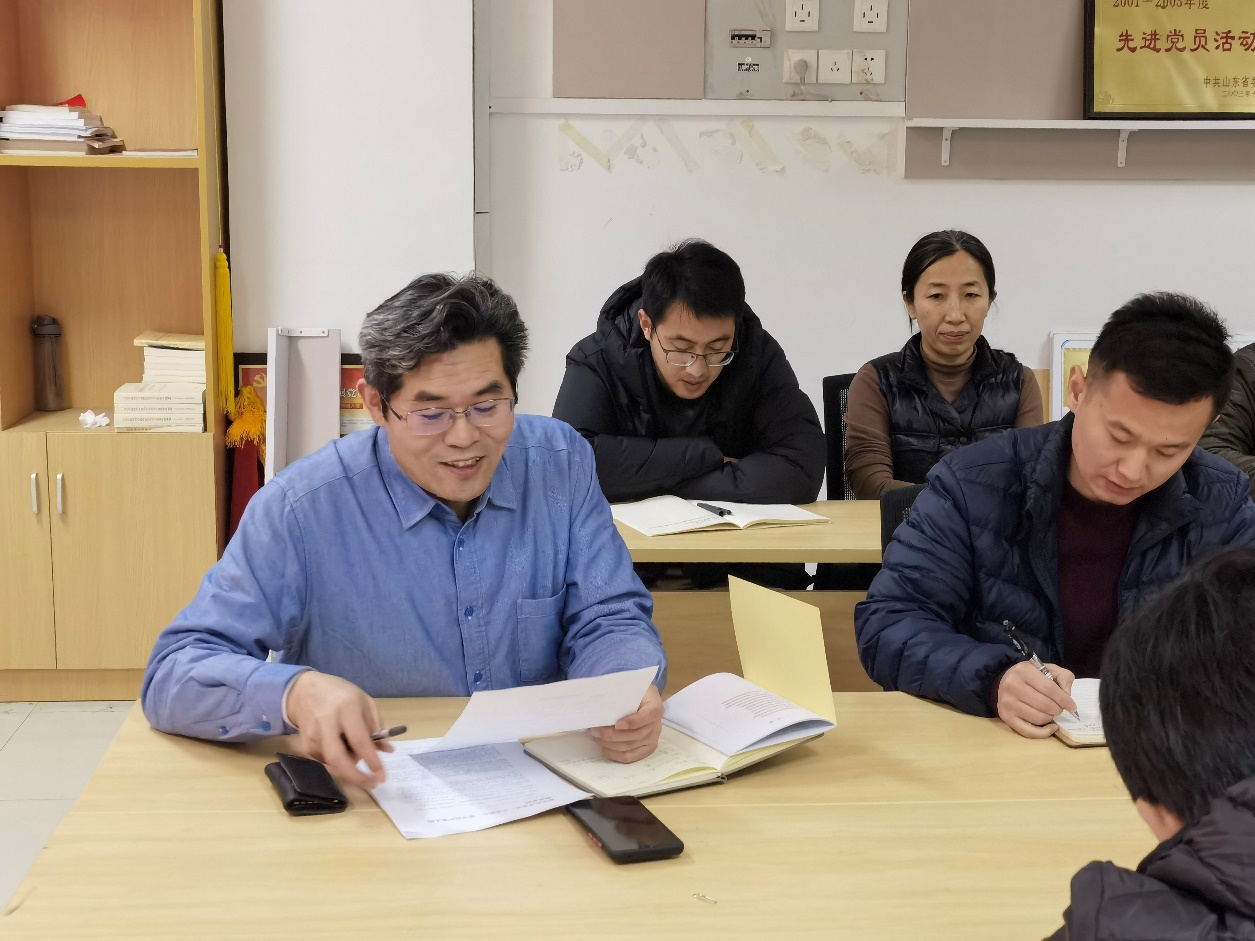 张立强教授首先向参会党员介绍了资源系党支部入选山东省“双带头人”教师党支部、以及党支部建设规划情况。然后,结合12月份支部的学习活动,带领参会党员集体学习新华社评论员文章——《不忘初心,坚守共产党人的精神家园》,该文章评述了关于“牧民省长”尕布龙的平凡而伟大的一生,教育广大党员行动是最有力的证明,奉献是最朴实的语言,坚守共产党人的精神家园,就要心中有党,始终用行动诠释对党的忠诚;坚守共产党人的精神家园,就要心中有民,始终把人民放在心中最高位置;坚守共产党人的精神家园,就要心中有责,始终把责任扛在肩上。张立强表示,作为高校党员教师,要做到心中有学生,做好教书育人的本职工作。随后,张立强教授重点介绍了“双带头人”工作室建设任务,包括强化党支部政治功能、抓好党建主责主业、提升思想政治工作质量、促进学校事业发展和加强党支部班子建设。