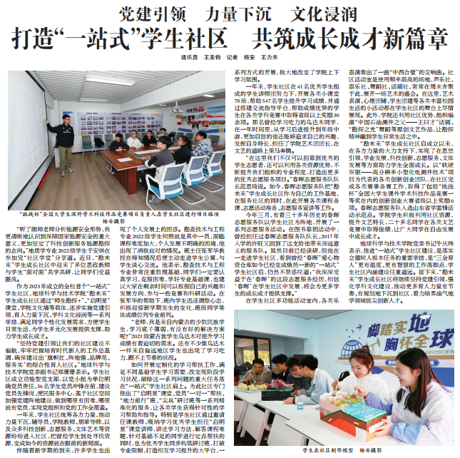 3月30日,中国石油大学报以《党建引领 力量下沉 文化浸润 打造“一站式”学生社区 共筑成长成才新篇章》为题,报道了MG冰球突破官网网站在社区育人综合体方面的探索与实践。