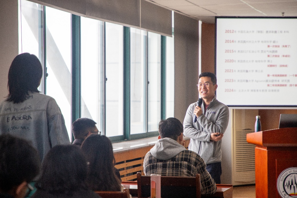王久源首先谈及本科在石大求学的日子,本科的四年是他认为真正的心无旁骛学习的时光,在石大严谨的学风中,除了收获很多专业知识,最让他受益终生的是养成了“长时间稳定地集中注意力在一件事上”的能力。他认为,在个人成长道路中,我们做出的选择很多时候是随机的,但是形成的习惯对于这些选择的帮助是最大的。他经常和身边的人讲:“如果有一件事,能让你花很多时间心无旁骛地去做,那么这件事就可以作为你的爱好,甚至你未来的职业追求。”。