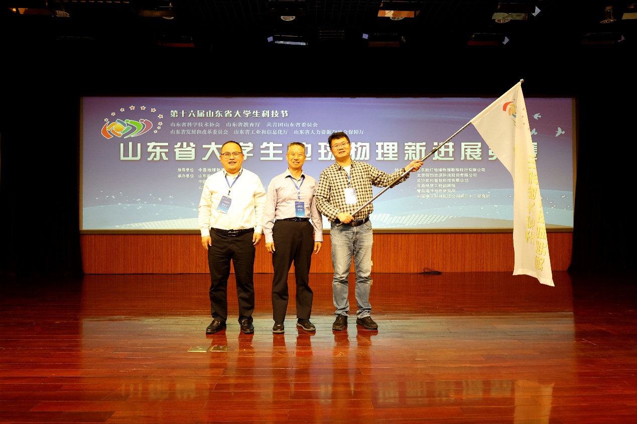 在闭幕式上,中国地球物理学会副理事长郭建表示本次竞赛通过改革赛式,集高校、科研院所于一体同台创新竞技,对探讨地球物理人才培养新模式具有重要意义,希望山东省地球物理协会能够在推动地球物理行业科技创新发展、服务地球物理行业人才培养新模式方面,做出更多新贡献。山东省地球物理学会党支部书记孙成中对本次竞赛的筹办给予充分肯定,对竞赛获奖的师生表示由衷的祝贺,并向为本次大赛辛勤付出的主办方、指导单位、协办单位、评委和组委会工作人员表示感谢。随后举行了该项竞赛的承办单位交接仪式,中国海洋大学海洋地球科学学院院长助理邹志辉教授,代表下届赛事承办方进行发言,表示将会向各位兄弟高校及单位学习办会经验,把下届竞赛办的更加精彩。