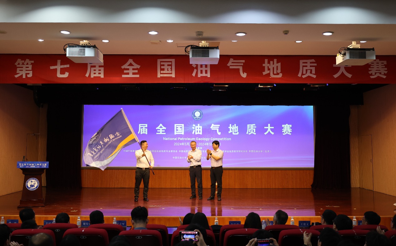 闭幕式上,MG冰球突破官网网站、中国石油大学(北京)代表向第八届全国油气地质大赛承办单位长江大学代表交接赛旗。