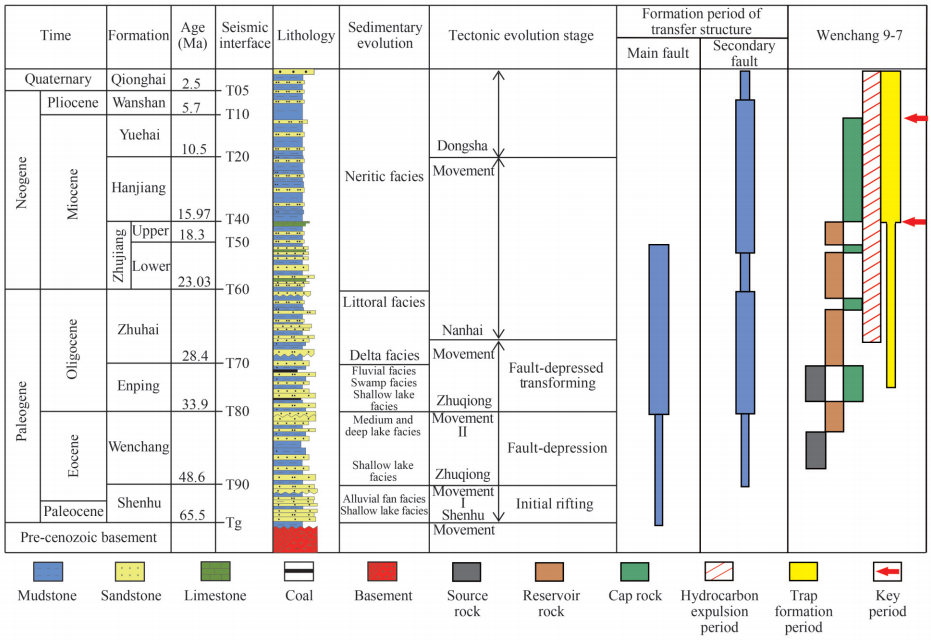 图1.文昌A凹转换带地层柱状图及沉积、构造演化及油气成藏事件图