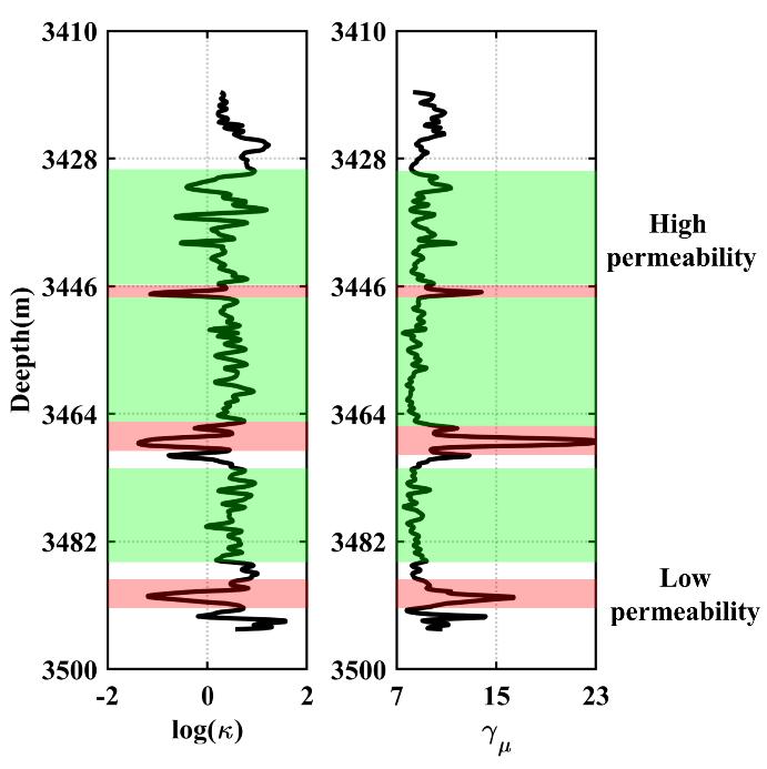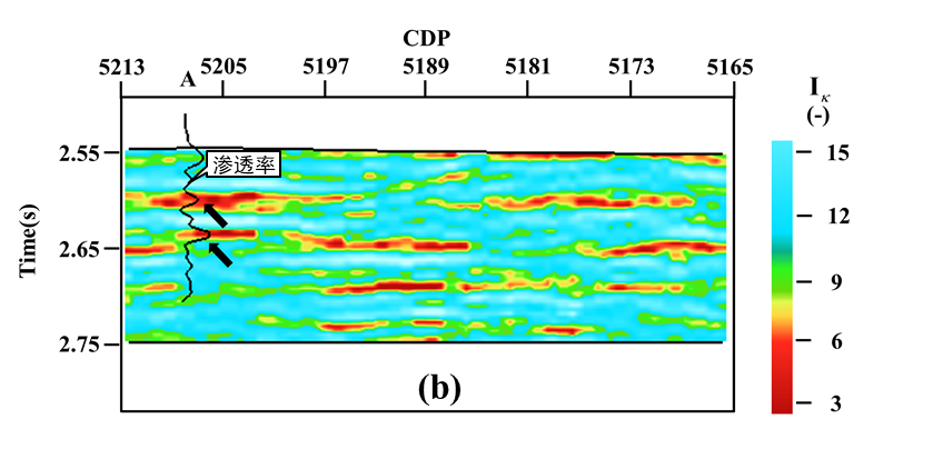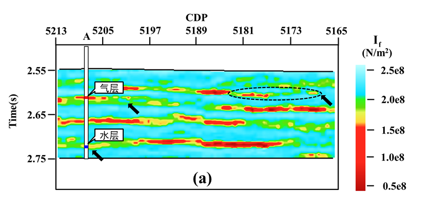 本研究选取了一组从四川盆地采集的砂岩样本数据,17个砂岩样本的孔隙度从1.3%到15%不等,平均孔隙度为10.3%,平均渗透率为0.29mD,揭示储层低孔、低渗特征。通过岩石物理分析,论证了孔隙结构参数(剪切柔度因子)与岩石渗透率之间的强相关性的岩石物理机理,并将剪切柔度因子定义为渗透性指示因子(图1)。利用碎屑岩储层的实测井数据进一步阐明了剪切柔度因子指示岩石渗透性的可行性(图2)。在此基础上,为从叠前地震资料中直接预测剪切柔度因子并指示储层渗透性信息,创新性推导了剪切柔度因子表征的反射特征方程。此外,近似方程的模型参数中包含新定义的流体因子,测井数据验证了新流体因子在流体类型识别方面的可行性。在贝叶斯叠前反演框架下,所提出的方法能够实现从叠前地震数据中直接预测储层的流体类型及渗透性信息,在东海深层碎屑岩储层的实际资料中取得了较好的应用前景(图3),克服了储层渗透性难以直接地震预测的难题,为储层综合评价提供了方法支撑。