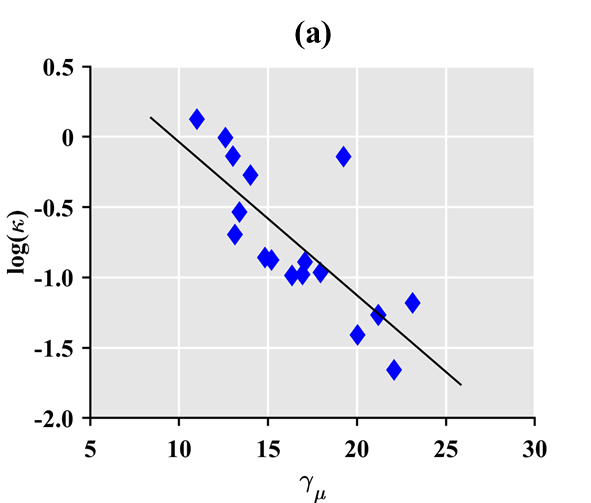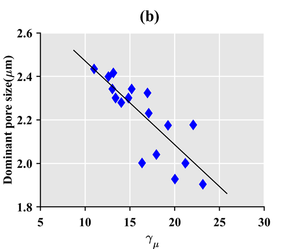 (a)剪切柔度因子和渗透率,(b)剪切柔度因子和主孔隙尺寸