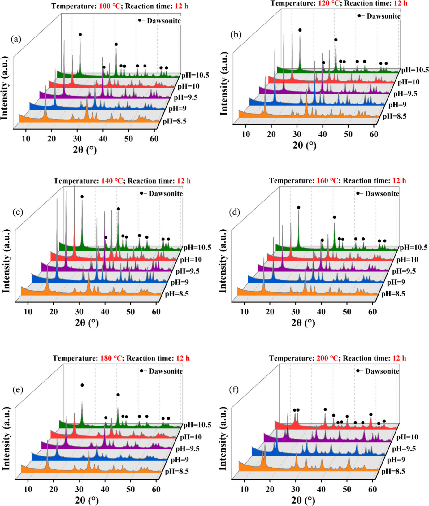 图1. 相同温度和不同pH值条件下合成的片钠铝石的 XRD图谱。(a) pH8.5–10.5,温度100 ℃,反应时间12小时;(b) pH8.5–10.5,温度120 ℃,反应时间12小时;(c) pH8.5–10.5,温度140 ℃,反应时间12小时;(d) pH8.5–10.5,温度160 ℃,反应时间12小时;(e) pH8.5–10.5,温度180 ℃,反应时间12小时;(f) pH8.5–10.5,温度200 ℃,反应时间12小时。