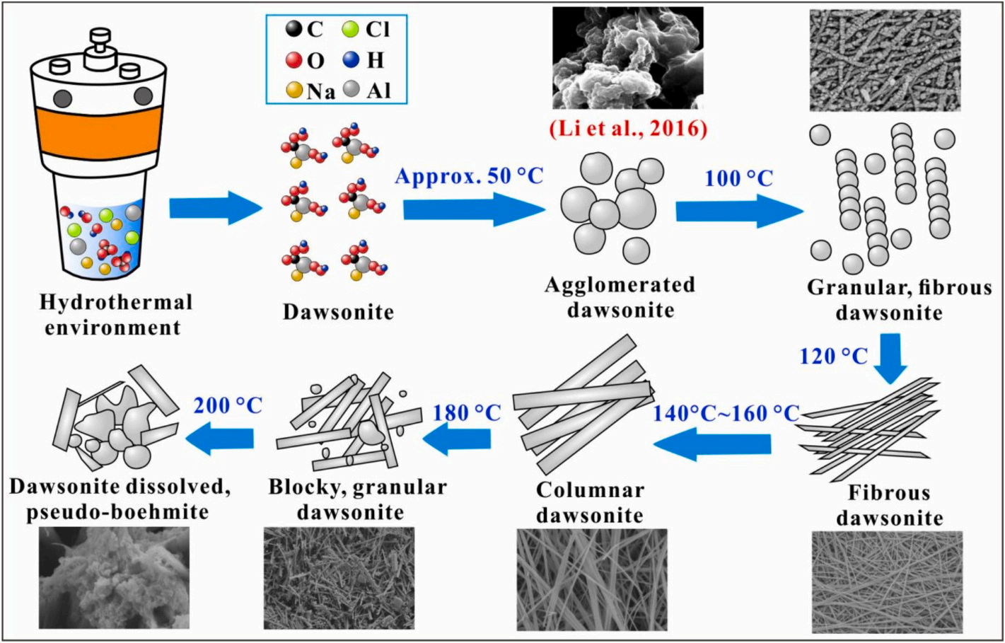 目前,片钠铝石的合成方法很多,但并不针对碳封存,且大多数合成方法都依赖含碳酸根或碳酸氢根离子的化学试剂作为实验前体,二氧化碳的参与有限,其最佳的合成条件仍存在争议。因此,探索如何在二氧化碳的参与下快速、大量合成片钠铝石,以实现二氧化碳矿化封存,值得进一步研究。针对上述问题,MG冰球突破官网网站MG冰球突破官网网站张洋晨博士在导师曲希玉副教授的指导下,基于物理模拟实验、X衍射分析、扫描电子显微镜分析等方法,以AlCl3 · 6H2O、NaOH、NaCl和CO2为初始原料,在不同温度、pH值和反应时间下,利用水热法合成了纯相片钠铝石。比较了不同条件下合成的片钠铝石的纯度、形态、尺寸和质量,明确了利用二氧化碳合成片钠铝石的最佳条件,探讨了片钠铝石的水热合成机理,并初步评估了片钠铝石的固碳潜力。结果表明,pH值为8.5–10.5、温度为 100–180 ℃,反应时间≥6 h,均可合成纯相片钠铝石(图1);温度和pH值都会影响片钠铝石水热合成的纯度、合成量和形态,温度对片钠铝石纯度和形态的影响更为明显;延长反应时间对片钠铝石的合成量和纯度影响极小;温度为140 ℃、pH值为9.5时,片钠铝石的合成量和二氧化碳矿化率均达到最大值。这表明该温度和pH值条件可能是利用二氧化碳进行热液合成道森石的最佳实验条件,也可能是二氧化碳矿化封存的理想条件。温度较低时(50 ℃),片钠铝石成核速率远大于生长速率,出现团聚现象;当温度达到100 ℃时,片钠铝石的成核速率和生长速率都会增加,并且粒状片钠铝石晶体沿一定方向逐渐长成针状;120~160 ℃时,生长速率大于成核速率,晶体均匀性和分散性增强,直径增大;温度为180 ℃时,生长速率和成核速率均降低,片钠铝石合成量显著减少,晶体直径减小;当温度为200 ℃时,片钠铝石开始溶解,体系中出现拟薄水铝石(图2)。该成果在二氧化碳矿化封存及片钠铝石快速合成以工业化利用等方面提出了新的认识。并将片钠铝石的稳定性及富集条件等纳入到后续研究中。