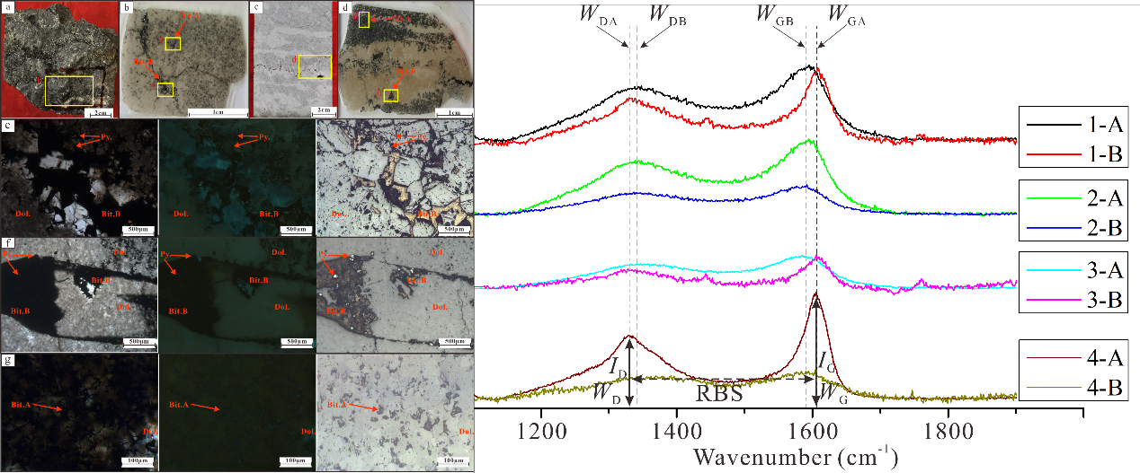 图1.四川盆地中部磨溪地区储层固体沥青特征及其拉曼谱图差异