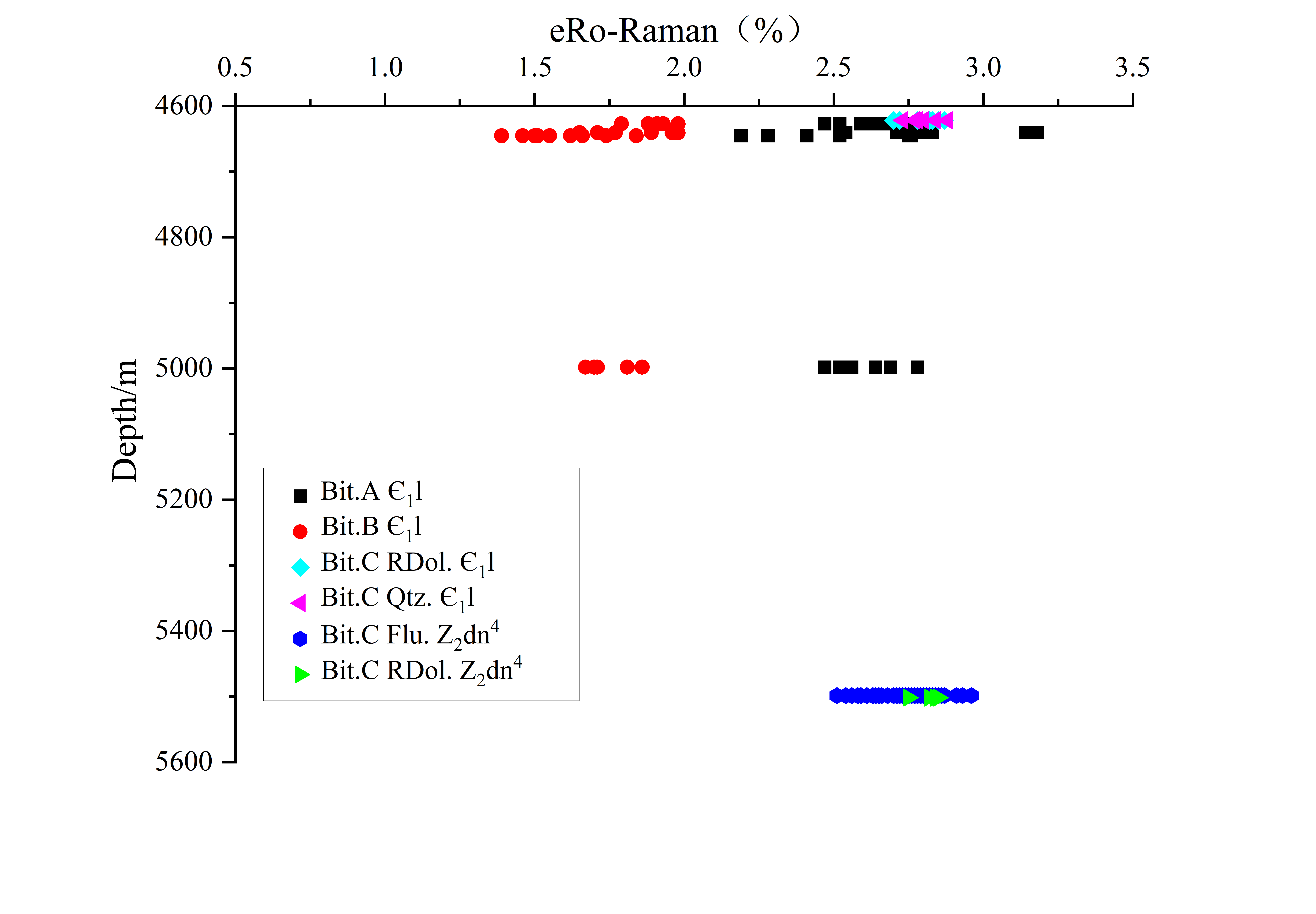 四川盆地中部地区安岳气田储层固体沥青含量丰富,分布广泛。MG冰球突破官网网站陈勇教授团队以川中磨溪地区寒武系龙王庙组(Є1l)和震旦系灯影组四段(Z2dn4)碳酸盐岩储层中孔隙和包裹体内的固体沥青为研究对象,系统开展了岩相学和固体沥青拉曼光谱、反射率及电子探针等分析工作,结果显示同源固体沥青在经历了相同的最高地温后,其成熟度存在显著差异(图1和2)。具体来说,根据岩石学观察,确定了三种类型的固体沥青(Bit. A、Bit. B和Bit. C)。Bit. A充填与早期细粒白云岩溶蚀孔隙,细小分散,eRo-Raman(通过拉曼光谱获得的等效镜质体反射率)值集中于2.60%~2.80%;Bit. B具较大的块状形态,分布在重结晶白云石或晚期自形之间的孔隙中或充填在缝合线中,eRo-Rama值在1.80%至1.90%之间;Bit. C为被各种成岩矿物捕获的沥青包裹体,eRo-Raman值在2.70%至2.87%之间(图2)。结合元素分析表明,硫元素的参与沥青热演化可能导致其成熟度的差异。该研究结果表明,在利用储层孔隙中(开放体系)固体沥青成熟度确定热演化史时应谨慎,而被捕获在包裹体(封闭系统)中的固体沥青作为成熟度指标更为可靠。