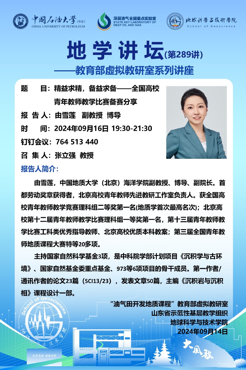 【地学讲坛第289讲】关于由雪莲 副教授 《精益求精,备益求备——全国高校青年教师教学比赛备赛分享》学术报告的通知