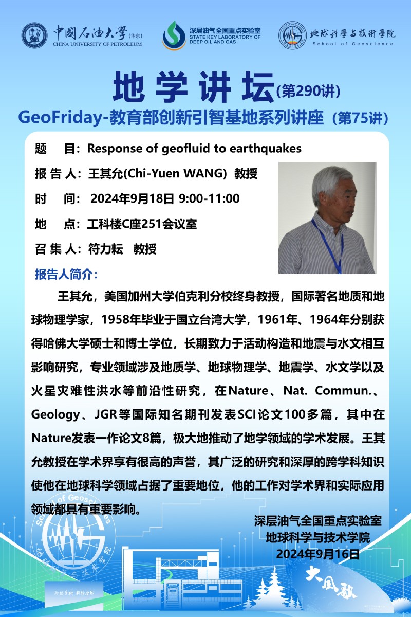 【地学讲坛第290讲】关于王其允(Chi-Yuen WANG) 教授《Response of geofluid to earthquakes》学术报告的通知