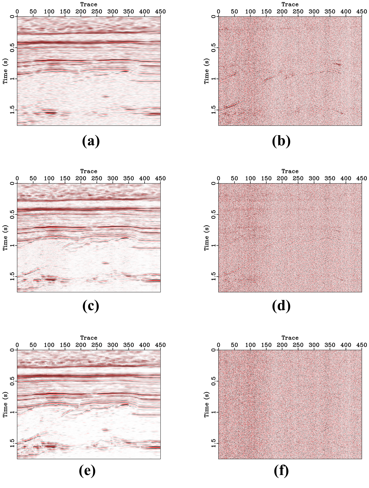 图2.西部资料去噪结果对比(a) f-x EMD去噪结果;(b) f-x EMD噪声剖面;(c)字典学习去噪。(d)字典学习噪声剖面。(e) FABEMD&SGK去噪结果;(f) FABEMD&SGK噪声剖面
