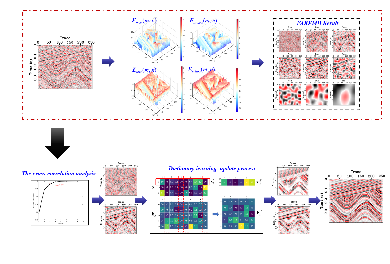 字典学习是一种比较有效地去噪的方法。然而,不断更新稀疏系数和字典需要大量奇异值分解的迭代过程,计算量巨大。对于强噪声掩盖的深层弱地震信号来说,信号的稀疏性较弱,单一字典学习压制很可能损伤信号成分。MG冰球突破官网网站SWPI课题组杨继东团队创新了一种结合快速字典学习和自适应高维经验模态分解(FABEMD)的噪声压制方法(图1)。该方法利用FABEMD在高维多尺度信号分解中的优势,充分考虑地震波传播的物理规律,对地震信号进行高维自适应分解,从而提高空间相关性。为了降低计算成本,采用极值滤波代替了传统的三次样条插值法来构建包络。通过对分解后的二维本征模态函数进行互相关分析,将信号分为高频组分和中低频分量,分别应用具有针对性参数的快速字典学习算法,对低信噪比(LSNR)下的弱地震信号进行了噪声压制。此外,该方法利用顺序广义K-均值算法替代了奇异值分解的迭代过程,在提高计算效率的同时,对弱地震信号具有很强的适应性。与f-x EMD、BEMD和传统字典学习方法相比,该方法在去噪效果上更具优势(图2)。
