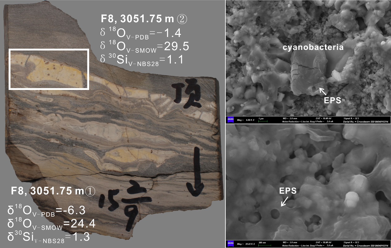 本次研究对玛北地区发育硅质岩的钻井进行了系统取样,通过光学显微镜、扫描电镜、元素地球化学、同位素等分析手段,明确了风城组:① 层状硅质岩层以及结节状的硅质团块为沉积成因,诱因包括淡水注入、蒸发浓缩、微生物降解诱导;② 微量元素及同位素分析指示了硅质层的沉积为热水成因;③ 热水环境发育的巨量微球状生物为重要的有机质类型,且通过全井段取芯的统计分布厚度大、分布范围广,具有规模;④ 微球状生物的硅化发生在准同生期,促使滨浅湖有机质得以保存。