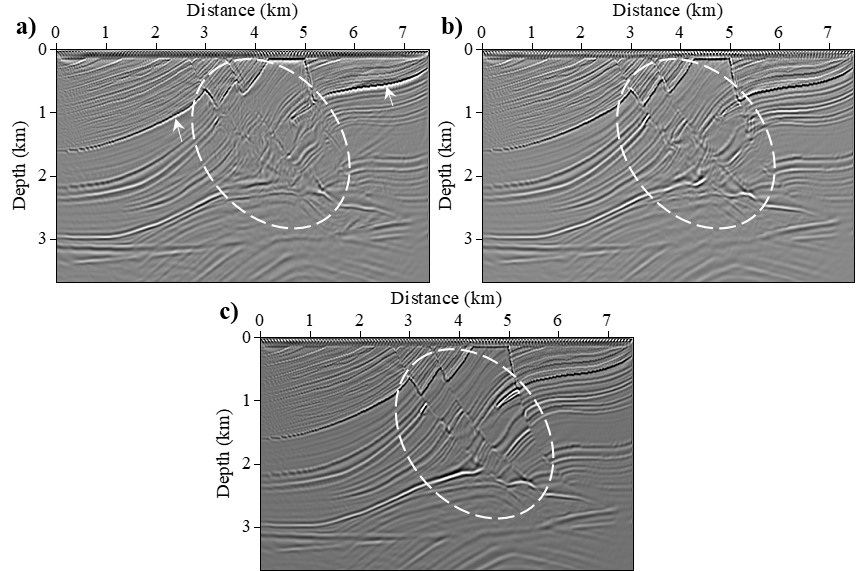 图2. 逆时偏移成像结果:(a)各向同性逆时偏移;(b)横向各向同性逆时偏移;(c)倾斜横向各向同性逆时偏移。