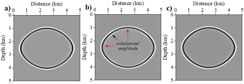 图1. 不同方法数值模拟结果对比:(a)参考解;(b)Xu等2015方法;(c)本文方法。
