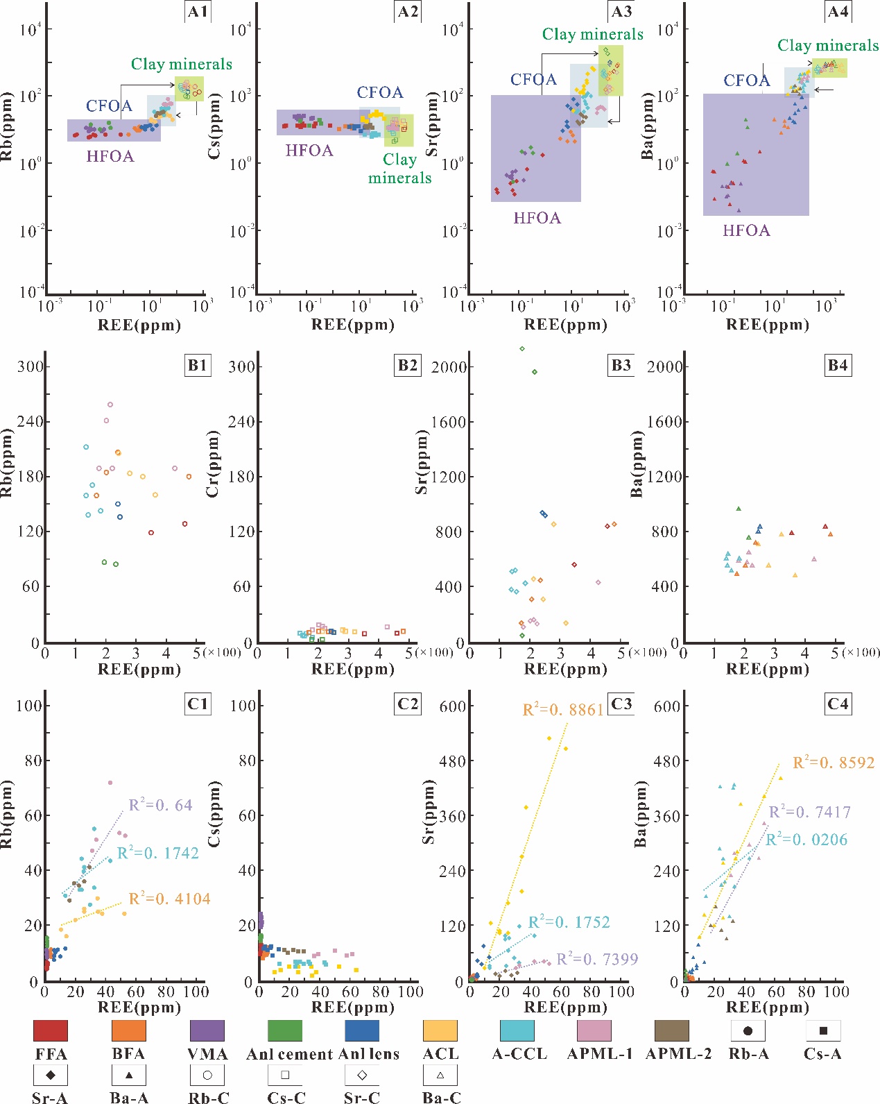 研究根据产状差异将方沸石划分为6种类型(纹层型、裂缝充填型、生物介壳充填型、脉体边缘晶、胶结型)。根据主要元素指标(Si/Al和10K/(10K+Na))将上述六种类型的方沸石进一步划分为热液流体来源方沸石(胶结型、脉体边缘晶、裂缝充填型方沸石和生物介壳充填型方沸石)和原生流体来源方沸石(纹层型方沸石)。热液流体来源方沸石∑REE较低并与大离子亲石元素含量呈强正相关;原生流体来源方沸石∑REE较高且与大离子亲石元素含量呈弱正相关(图1)。