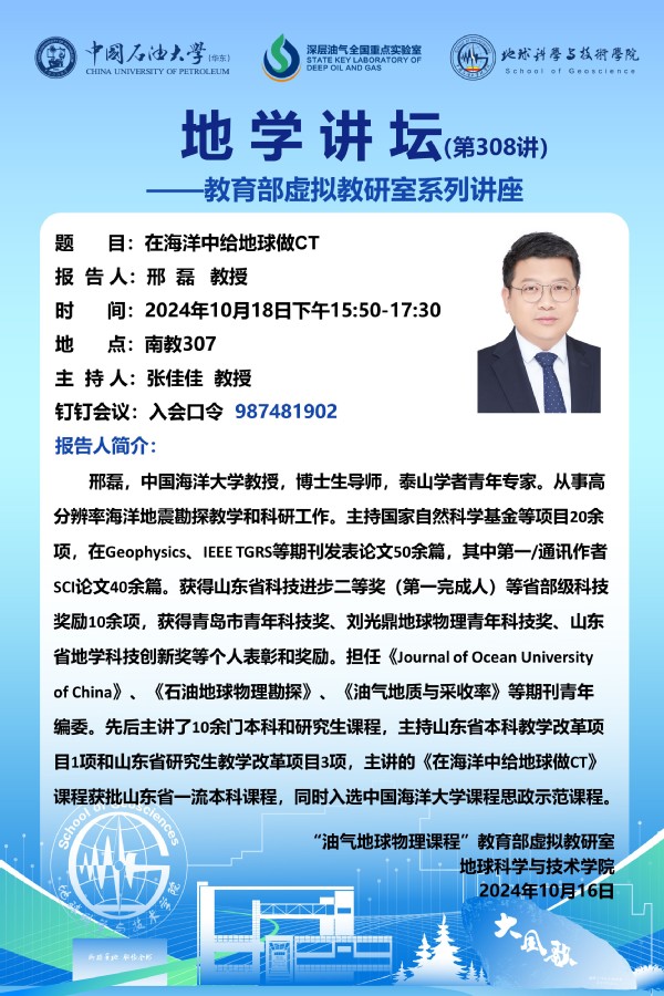 【地学讲坛第308讲】关于邢磊 教授 《在海洋中给地球做CT》学术报告的通知