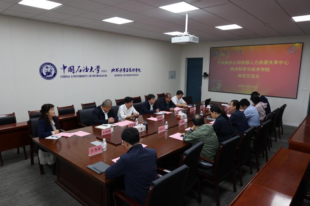 10月18日上午,中油测井公司西部人力资源共享中心主任马忠军一行6人来院座谈交流,学院副院长王冠,党委副书记郑珊珊,测井系主任张锋、教授范宜仁、副主任陈雪莲、副教授张凯以及学院团委书记王力禾参加座谈会。