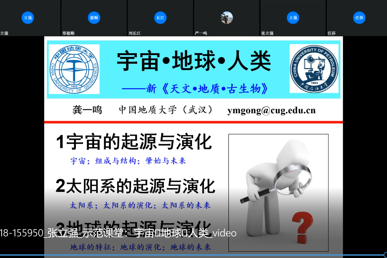 报告人简介:龚一鸣,男,湖北武汉人。“万人计划”国家级教学名师,全国模范教师,首批全国高校黄大年式教师团队——地质学教师团队负责人,地史古生物学国家教学团队负责人,教育部课程思政示范课程教学名师,教育部首批虚拟教研室——地球生物学课程虚拟教研室带头人,享受国务院特殊津贴专家。湖北省师德标兵和有突出贡献的中青年专家,湖北省楚天园丁奖和五一劳动奖章获得者。中国地质大学(武汉)二级教授,博士生导师。曾任地大教育教学工作指导委员会主任。曾获国家级教学成果奖二等奖,湖北省教学成果奖特等奖和一等奖,省部级科技成果奖一等奖等奖项,发表SCI论文100余篇,主持建成4门次国家级在线课程和“地史学”国家级一流本科课程,出版《大学的从教之道》、《地球的过去与未来》、《地层学基础与前沿》等教材和专著10余部。