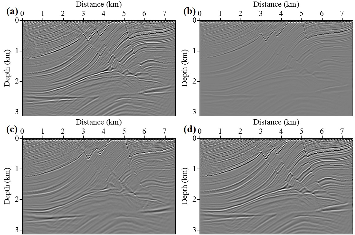 图2. 不同逆时偏移结果对比图:(a)声波TTI逆时偏移(作为参考);(b)TTI逆时偏移;(c)粘声Q补偿逆时偏移;(d)粘声TTI Q补偿逆时偏移