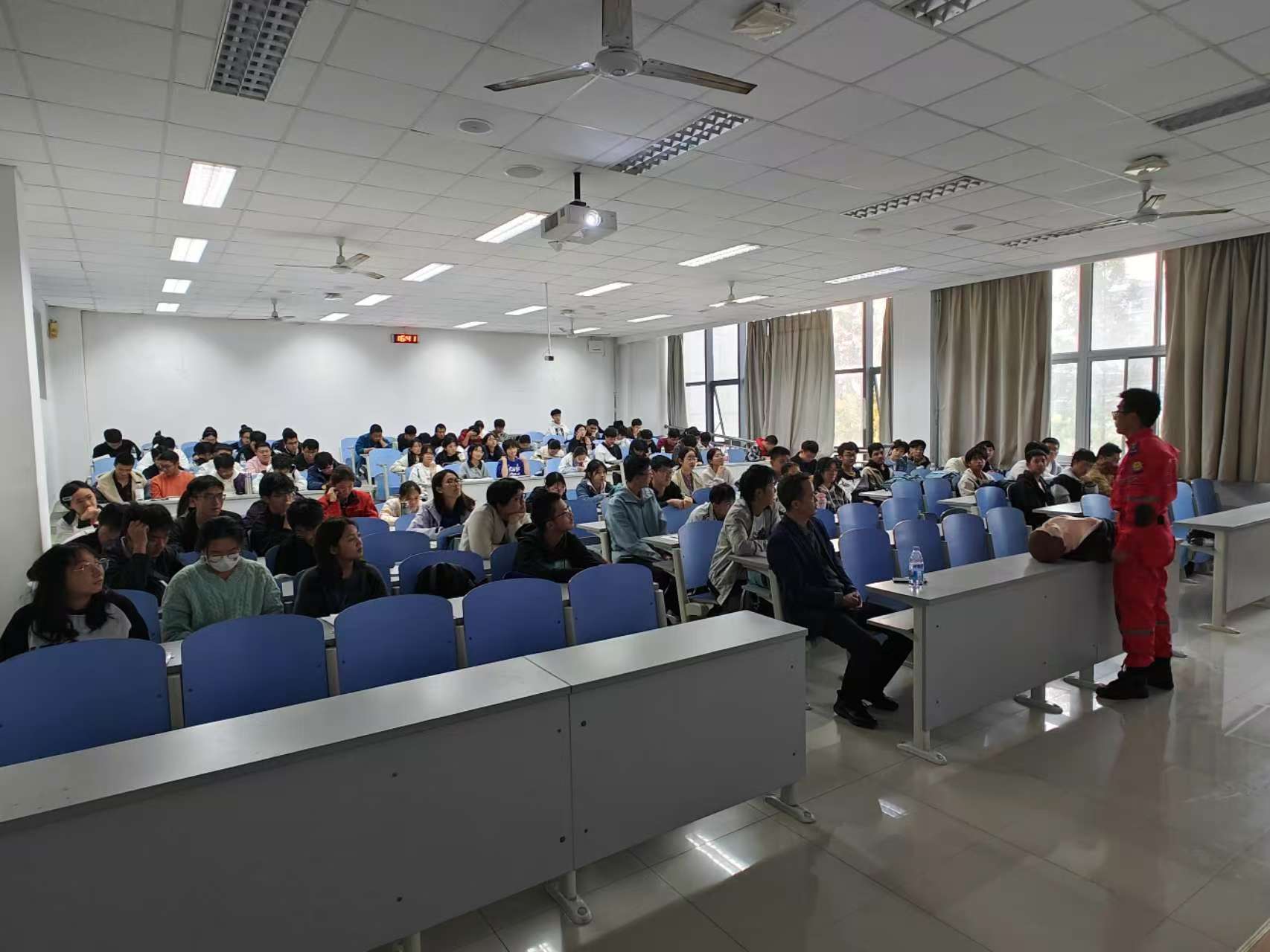 讲座特邀青岛西海岸新区“山海情”救援联盟薛成瑾队长担任授课嘉宾。薛队长结合多次国内地震救援实例,从地震基础知识、科学避震要点、自救互救技能等方面进行了详细讲解,对学生重点培训了环境安全确认、意识与生命体征判断、胸外按压的精准操作、人工呼吸的技巧以及AED除颤仪的实操要领。讲座上,学生们展现出了极高的学习热情和强烈的求知态度,踊跃与薛队长进行互动交流。