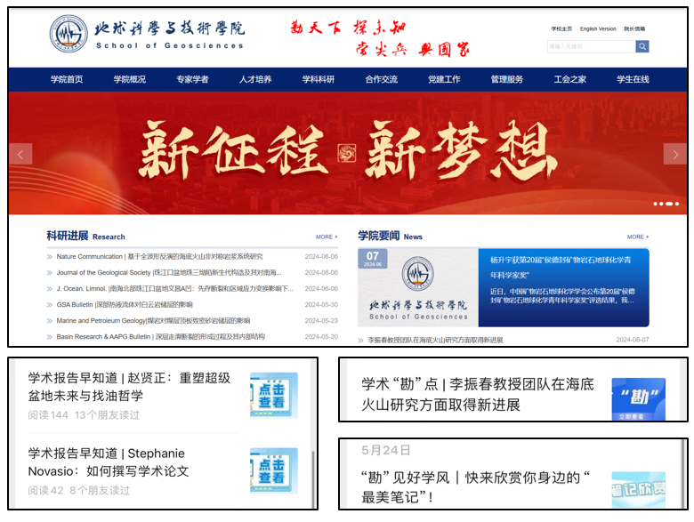 同时,学院官方微信公众号“勘天下”创设学术报告早知道、学术“勘”点、“勘”见好学风等专栏,将学院最新学术讲座、学术研究动态、学风建设榜样等动态及时推送到学院内外。既让校内外特别是专业领域了解到学院科研学术的最新成果,传达出学院“学科立院、人才强院、创新兴院”的治院理念,也在院内形成潜心学术、追求卓越的氛围。