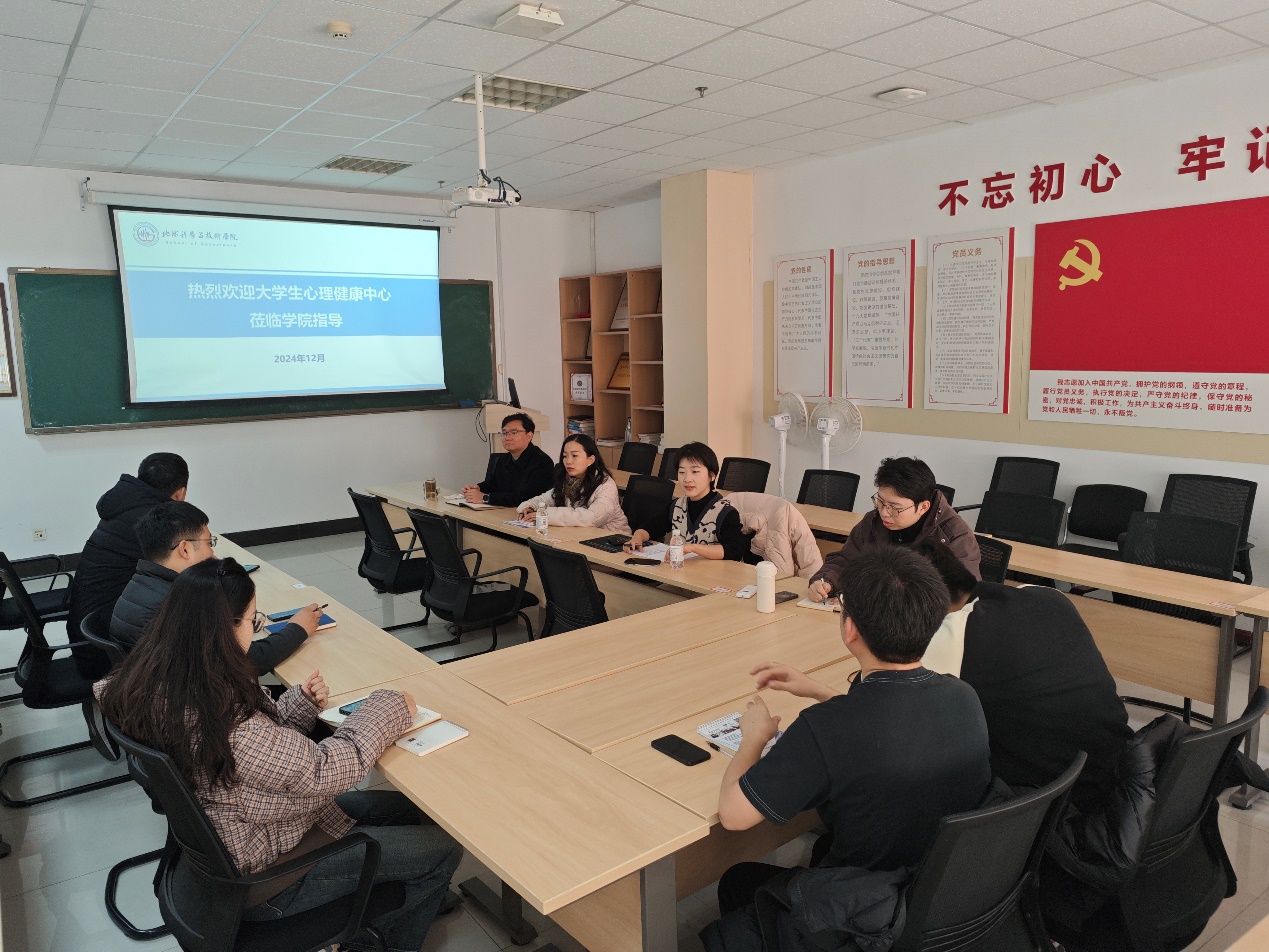 为提升心理育人工作成效,12月6日学校大学生心理健康中心辛晓雯老师到学院开展心理健康工作座谈会,学院党委副书记郑珊珊以及全体辅导员参与会议。