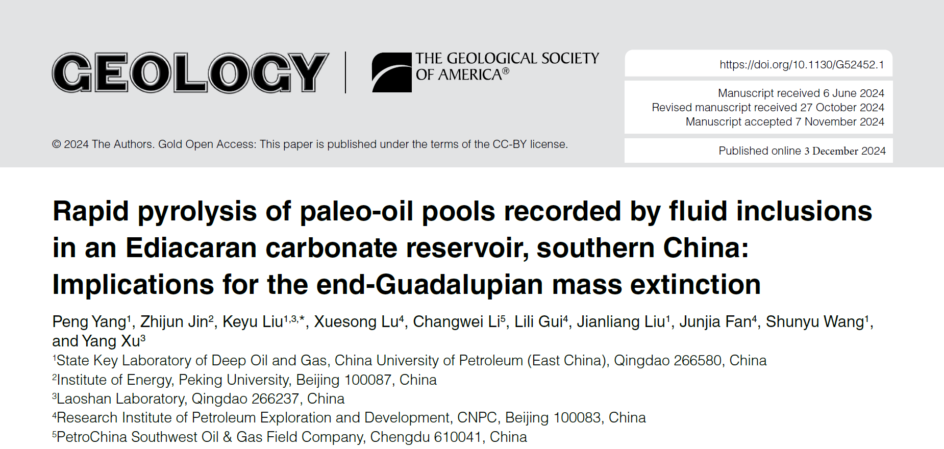 近日,MG冰球突破官网网站刘可禹教授团队联合北京大学金之钧院士和中石油勘探开发研究院CNPC盆地构造与油气成藏重点实验室等单位在沉积盆地地质流体研究方面取得新进展,相关成果《流体包裹体记录了中国南方埃迪卡拉纪碳酸盐岩储层中古油藏的快速热解:对瓜德鲁普世末期大灭绝的影响》(Rapid pyrolysis of paleo-oil pools recorded by fluid inclusions in an Ediacaran carbonate reservoir, southern China: Implications for the end-Guadalupian mass extinction)发表在地球科学领域国际顶级期刊Geology上。论文第一作者为杨鹏博士后,通讯作者为刘可禹教授;MG冰球突破官网网站为第一署名单位,该研究得到国家自然科学基金、中石油科技发展项目、山东省自然科学基金以及中国博士后科学基金项目的联合资助。