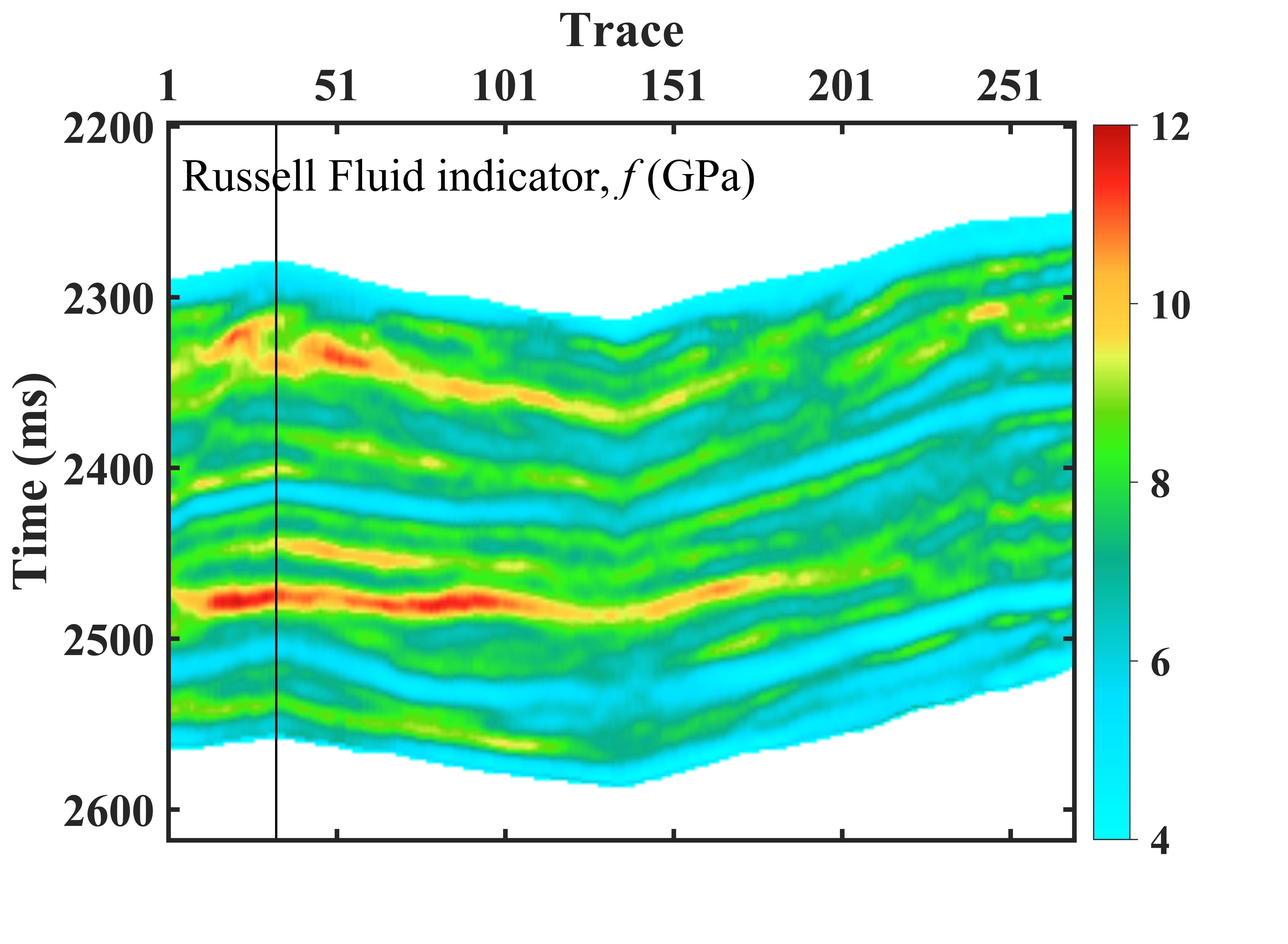 针对初始地应力作用下反射系数方程非线性强、三阶弹性模量难以估算、方程难以有效应用于实际的难题,研究团队聚焦初始水平应力作用下饱和多孔储层介质,创新性地引入了应力诱导各向异性参数以表征介质刚度矩阵及其空间扰动矩阵,一定程度消除了正反演过程中对三阶弹性模量的需要,借助弹性逆散射理论推导了流体因子表示的饱和多孔储层地震反射系数近似方程,耦合地震子波的作用,在贝叶斯反演框架下实现了流体因子地震反演(部分叠前地震数据如图4a所示),进而对含流体储层进行有效刻画(如图4b黑色箭头所示)。