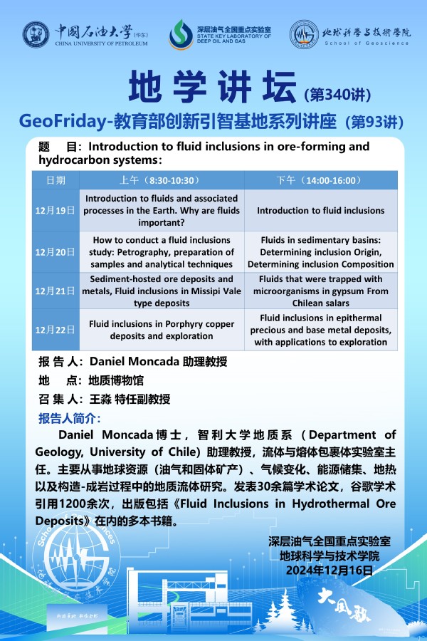 【地学讲坛第340讲】关于 Daniel Moncada 助理教授 《Introduction to fluid inclusions in ore-forming and hydrocarbon systems》系列学术报告的通知