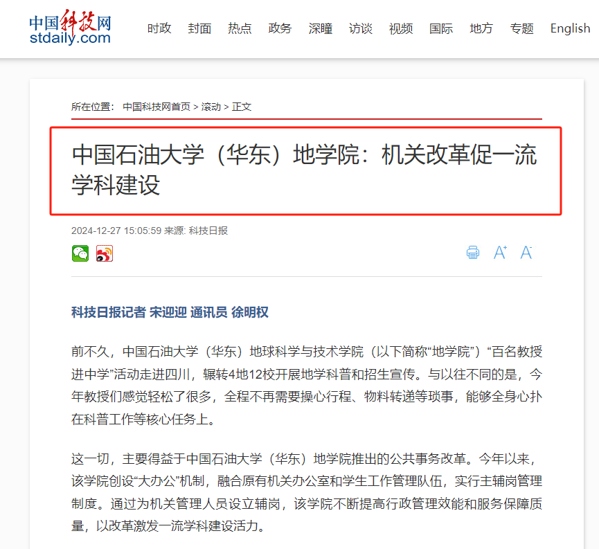12月27日,科技日报·中国科技网以《MG冰球突破官网网站MG冰球突破官网网站:机关改革促一流学科建设》为题,报道学院公共事务改革典型经验,获得广泛关注。