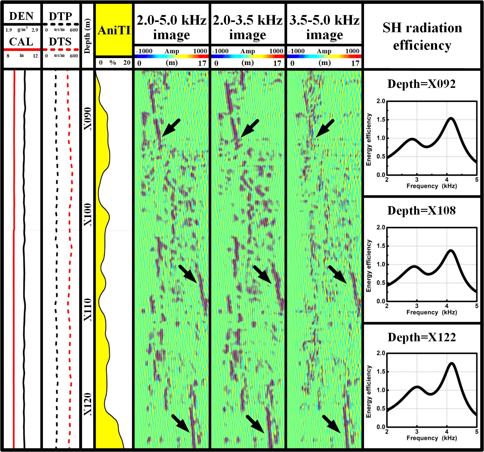 图2.使用辐射效率(第7道)解释各向异性地层中2.0-5.0 kHz(第4道)、2.0-3.5 kHz(第5道)和3.5-5.0 kHz(第6道)不同频段成像的现场实例