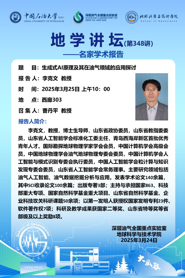 【地学讲坛第348讲】关于 李克文 教授《生成式AI原理及其在油气领域的应用探讨》学术报告的通知