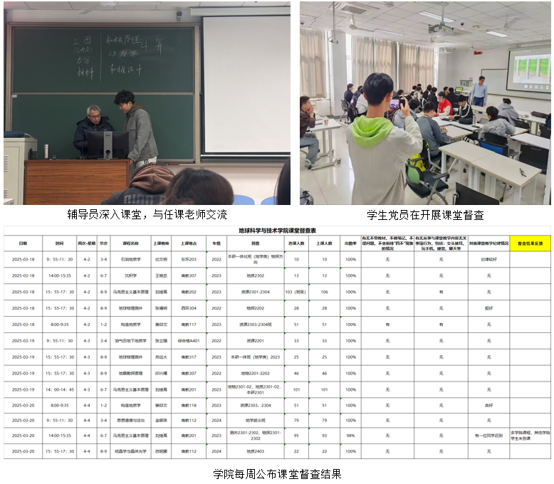多方巡查抓课堂,严抓学风树新貌。学院继续严格执行“班内自查-辅导员检查-学院督查”三级课堂检查制度,组建了一支以高年级学生党员为主体的课堂督查队伍,实施“督查-反馈-整改”机制。督查队伍每日开展课堂考勤、课堂效果检查,进行课堂督查情况通报,当天反馈整改形成有效闭环,每周在学院网站公示督查结果。同时,辅导员进行日常巡课,与授课教师交流,了解教学进度和同学们的学习表现,及时发现并解决同学们在学习中遇到的问题。在师生共同督查“多重保障”下,学生出勤率、抬头率、前排落座率得到了显著提升。
