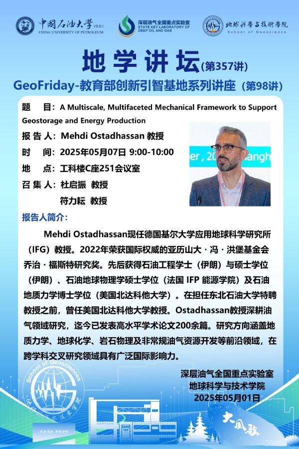 【地学讲坛第357讲】关于 Mehdi Ostadhassan 教授《A Multiscale, Multifaceted Mechanical Framework to Support Geostorage and Energy Production》学术报告的通知