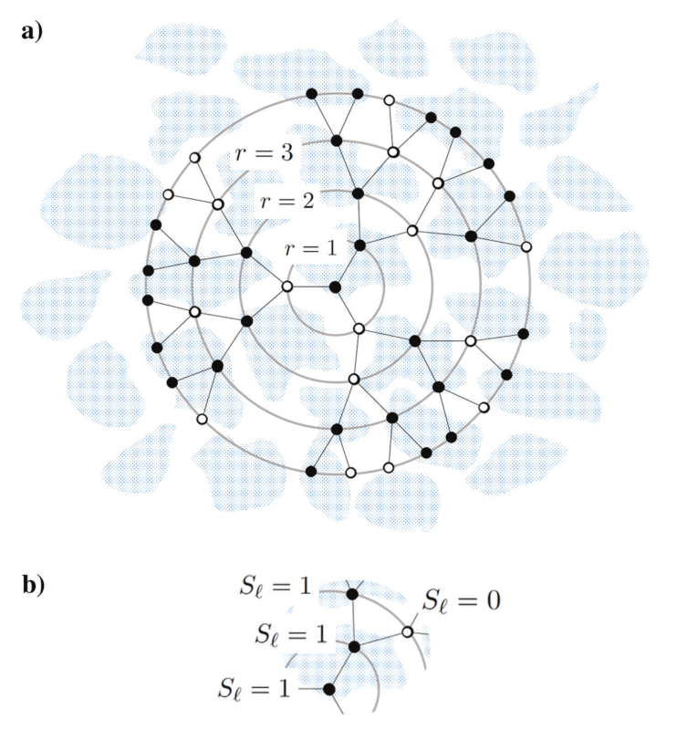 图1.介观流体斑块(浅蓝色)被Bethe网格覆盖的示意图:(a)每个结点有三个相邻的结点,结点以整数距离r分布;(b)浅蓝色区域内的结点用实心圆表示(高饱和度),白色背景区域的结点用空心圆表示(低饱和度)