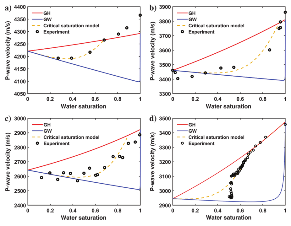 我们使用临界饱和度模型对四组不同类型岩石的实验数据进行了建模,重点分析了饱和过程中流体斑块大小的变化。结果表明,随着含水饱和度的增加,斑块大小增大,临界饱和度模型的预测结果与实验数据基本一致(图2)。本方法提高了部分饱和岩石速度-饱和度关系解释的准确性,为利用地震资料探测油气藏开发、地下水监测与管理、二氧化碳地质封存等流体作业过程中的流体赋存状态奠定了基础。