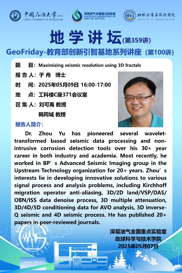 【地学讲坛第359讲】关于 于舟 博士《Maximizing seismic resolution using 3D fractals 》学术报告的通知