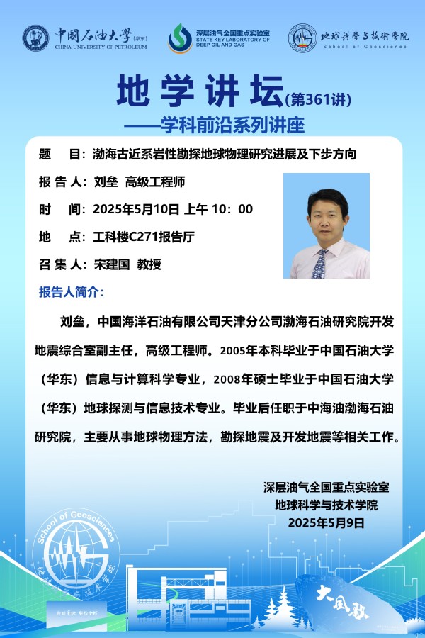 【地学讲坛第361讲】关于刘垒 高级工程师《渤海古近系岩性勘探地球物理研究进展及下步方向》学术报告的通知