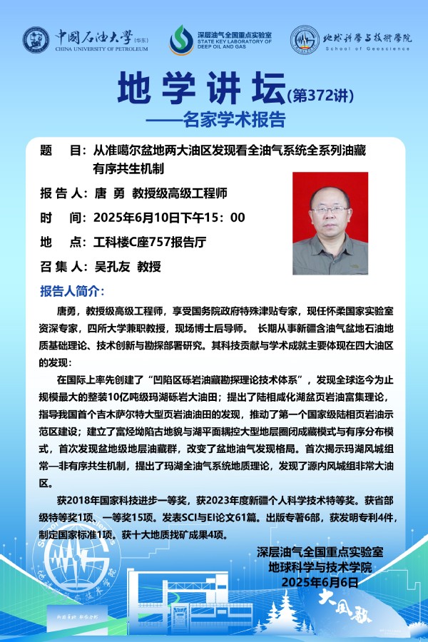 【地学讲坛第372讲】关于唐勇教授级高级工程师 《从准噶尔盆地两大油区发现看全油气系统全系列油藏有序共生机制》学术报告的通知